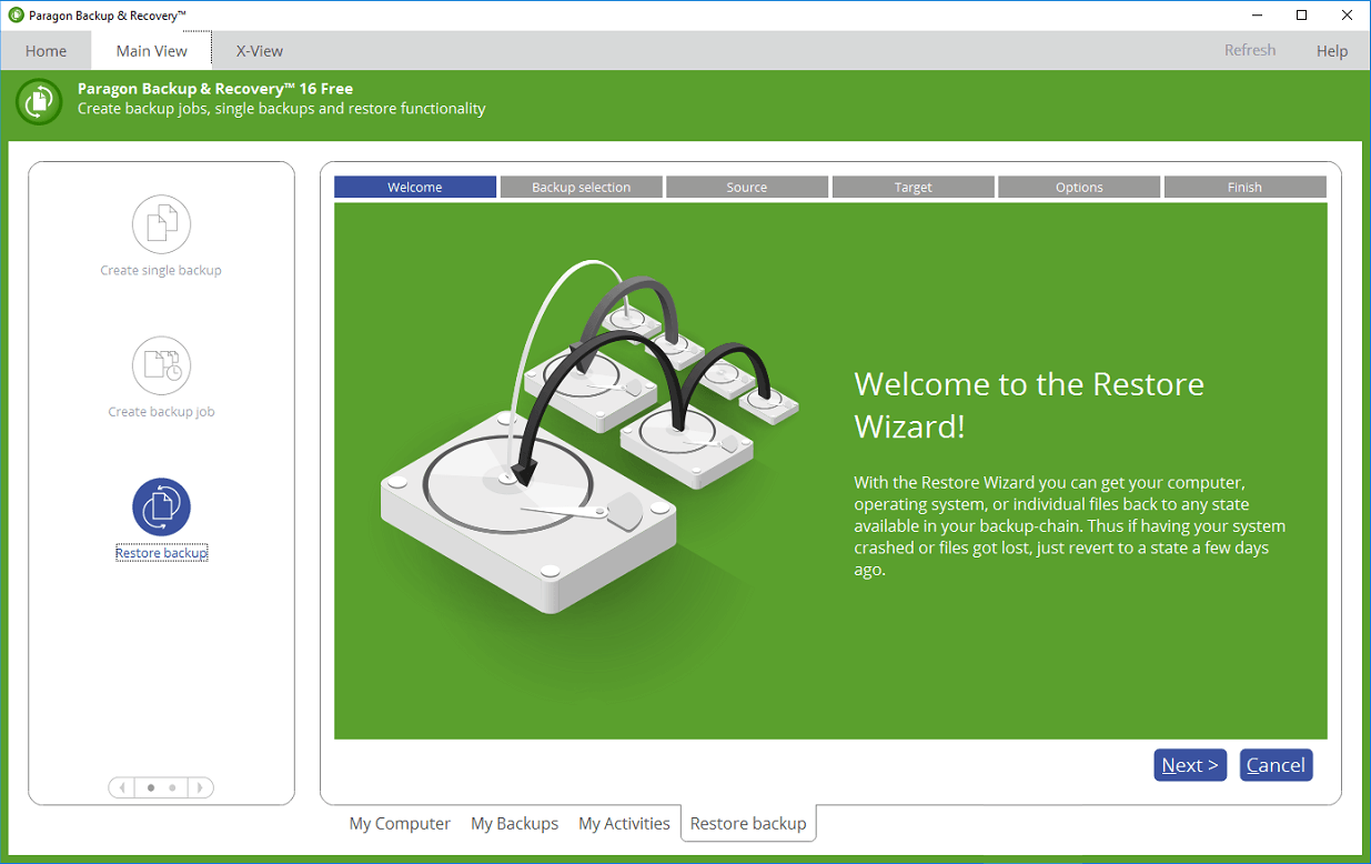 Open Paragon Backup & Restore, and select ‘Restore backup’: