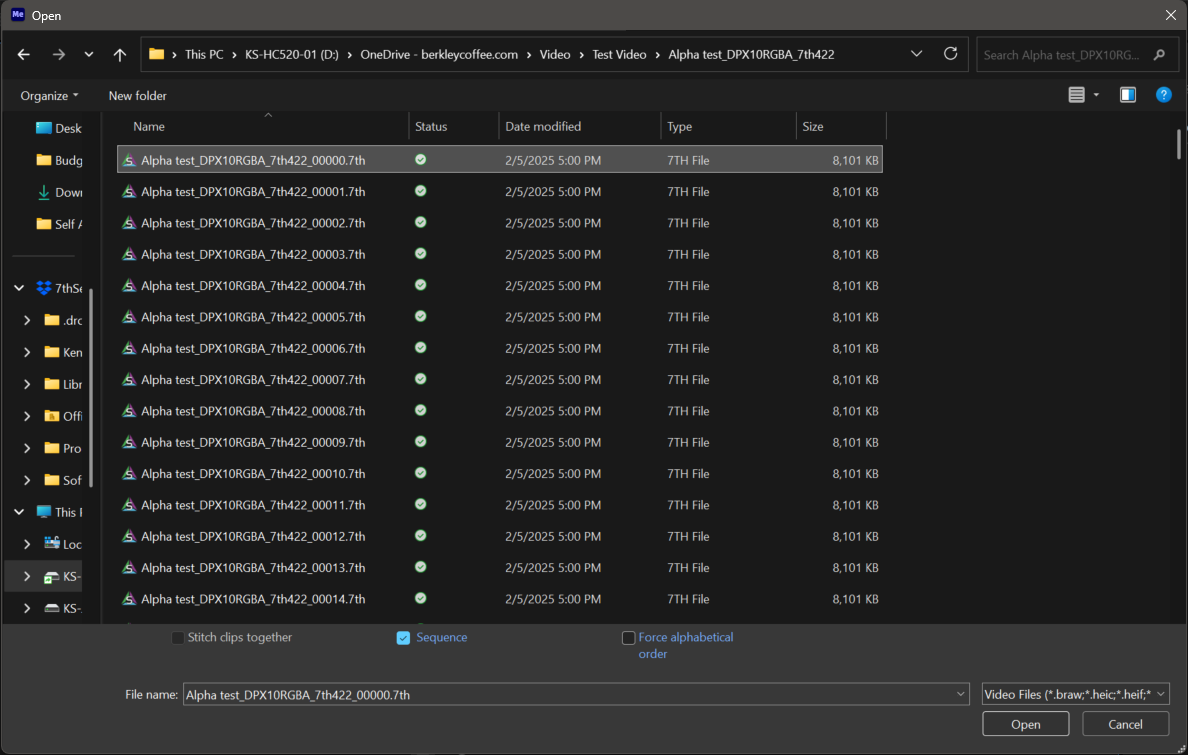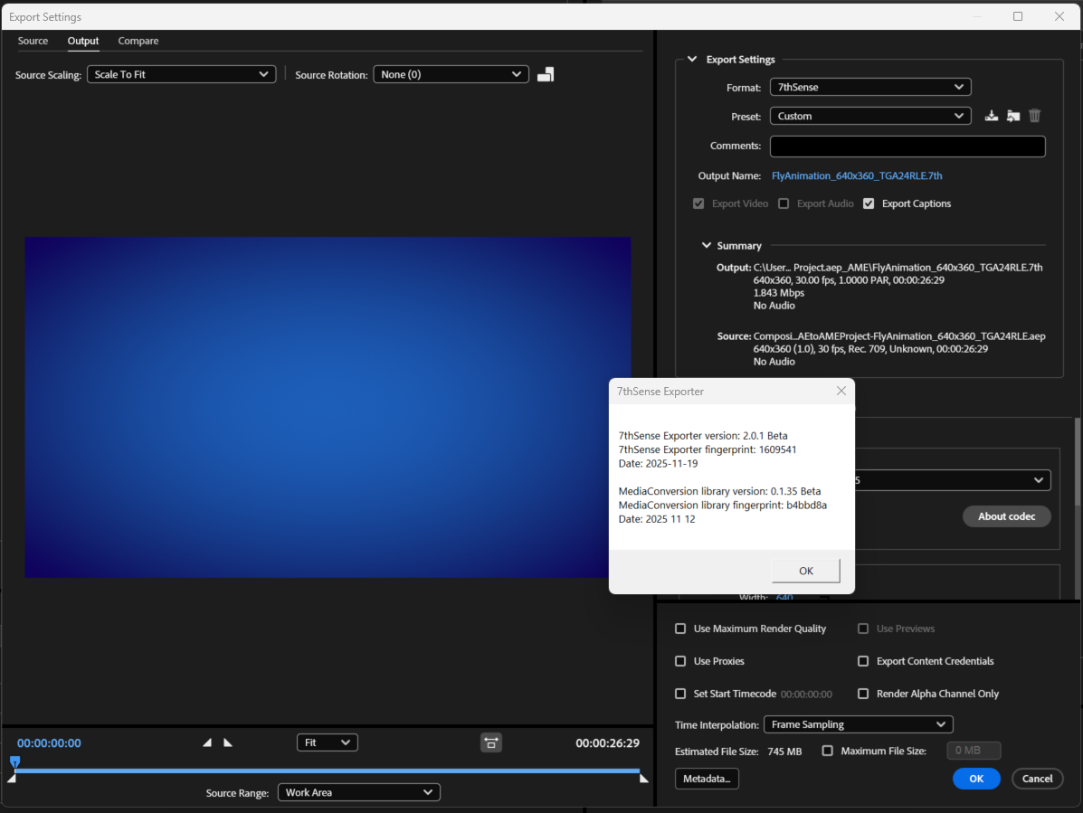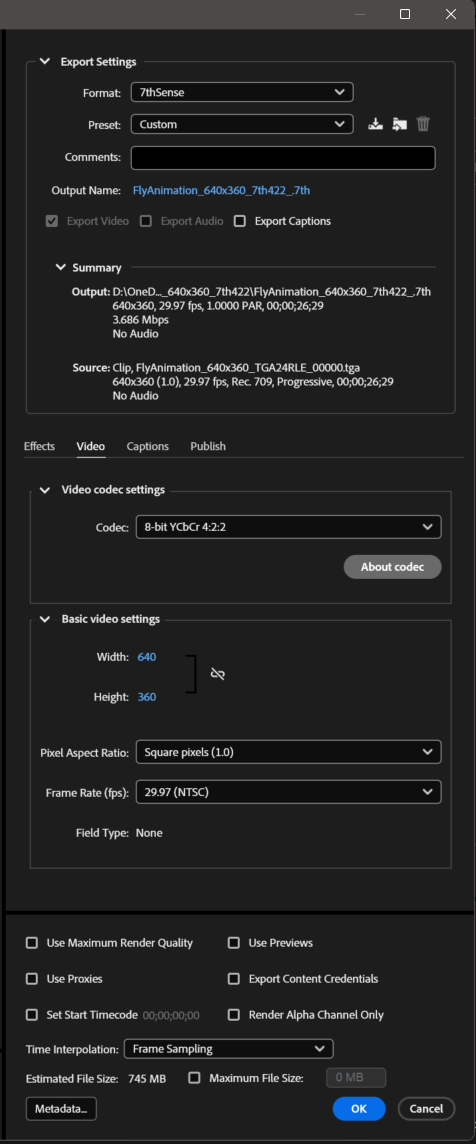Importing 1.Open Media Encoder 2.Browse in the Media Browser to a folder that contains a .7th or .sth image sequence. 3.INSTEAD, click File --> Add Source. 4.Browse to a folder that contains a .7th or .sth image sequence. 5.Single click just the FIRST indexed image file, ensure that the Sequence checkbox is checked, and Open. 6.Open that Queue item's Export Settings (by clicking the blue text in its Format column). 7.Click the Source tab (upper-left corner), and drag the playhead around a bit. You should see the images rendered. Exporting 1.Follow similar steps as written above to add ANY source movie/image sequence supported by Media Encoder to an After Effects Composition (and .7th sequences are now among those possibilities with our Import plugin installed.) 2.Open that Queue item's Export Settings (by clicking the blue text in its Format column). 3.Choose Format --> 7thSense. 4.Click the blue text beside Output Name to edit the export path and file naming. Remember that you are produced a sequence of images, so you should first create a new folder that will hold ONLY the new images, then enter that folder, and there set the base name of the image files will use. Upon export, AME will automatically add zero-padded frame index to whatever base name you choose. It is generally best practice to match the folder name and base name, but with an "_" added at the end of the base name (after which AME will add the frame index upon export.) 5.Under Video codec settings, choose a .7th subformat. 6.At this point you can just hit OK, unless you wish to intentionally change further parameters like scaling or frame rate. Note if you are converting FROM an image sequence TO an image sequence, it's value doesn't have to match the reality of the fps this clip is actually produced to play at. Just leave that setting as is and frames will enter and exit 1:1 with no rate conversation 7.Click Play button on the Queue |
