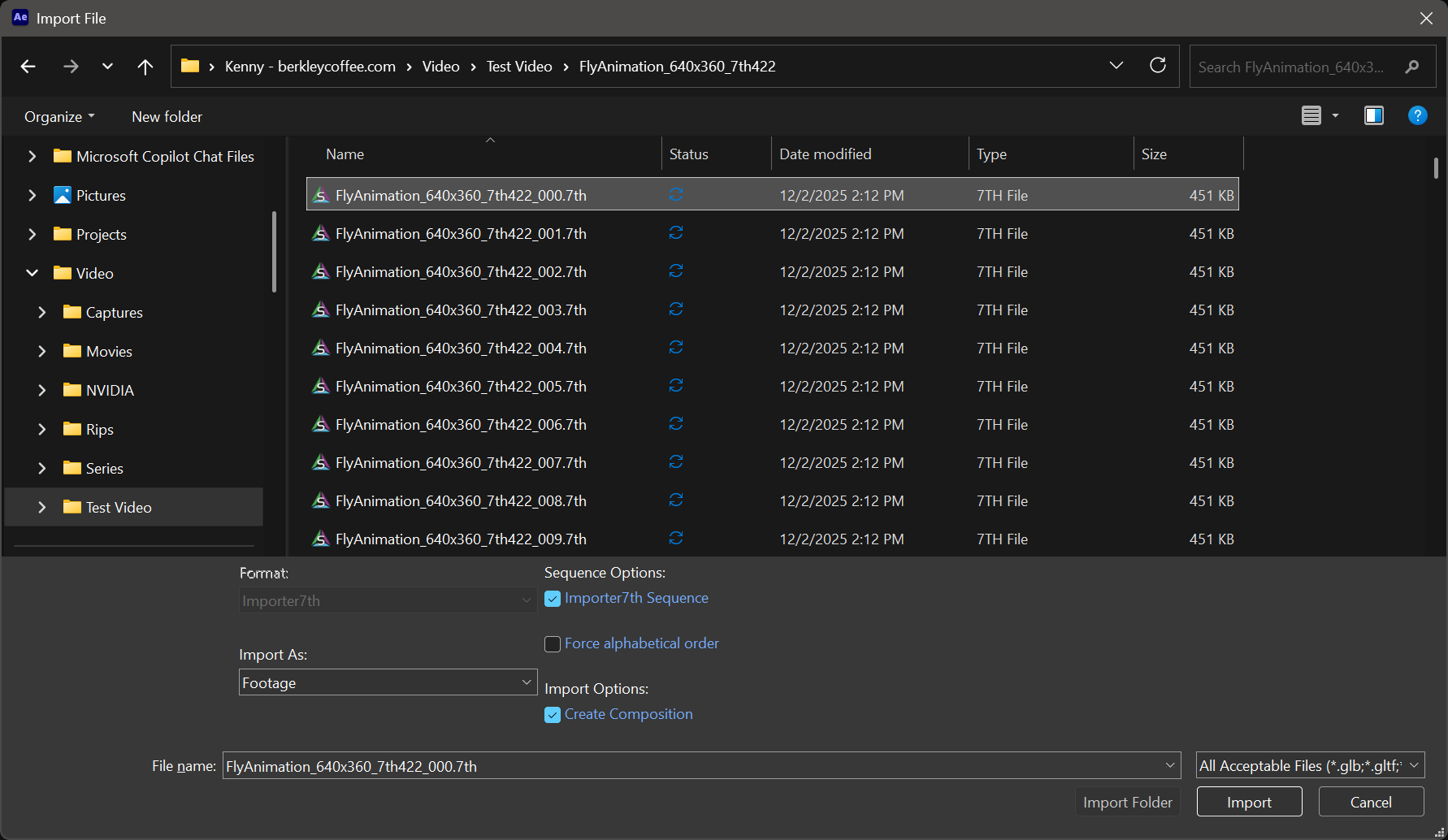 Importing 1.Run After Effects and Start a new Project, 2.Click File --> Import --> Files. Browse to a folder that contains a .7th or .sth image sequence. 3.Single click just the FIRST indexed image file, ensure that the checkbox Import7th Sequence is checked, as well as Create Composition, and then Import. 4.You should now see the .7th footage and a composition created based on that footage in the Project bin. Open that Composition and you should see the frames rendered in the Composition pallet.