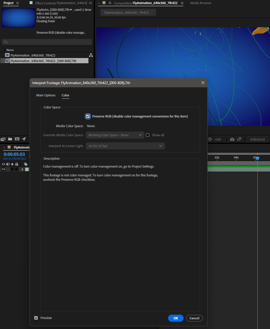 IMPORTANT CONSIDERATIONS: •If you are working with sequence with color bit depth beyond 8-bit, it's important to increase the project's working color depth in File --> Project Settings --> Color to "16 bits per channel" (the default being "8 bits per channel"). •AE will automatically applies some "Interpret Footage"settings to every given imported clip (and the Composition created based on those initial clip settings). For image sequences, it's important to review that both the Frame Rate and Color Space settings are appropriate. .7th files do not contain color space metadata, only the color bit values. So it's important to communicate with the media producer what color space the data was written to be interpreted as (e.g. Rec709). Also beware that After Effects is a color-managed workspace (configurable in File --> Project Settings -->Color). This means that all footage is conformed from its interpreted color space to the working color space for preview, composition, and ultimately export. • Exporting 1.Follow similar steps as written above to add ANY source movie/image sequence supported by After Effects to a Composition (.7th sequence are now included among those possibilities with our Import plugin verified above.) 2.Be sure to review Project Settings, and Interpret Footage settings for that clip (as discussed deeper in the Importing guidance.) 3.Select the composition in Project pallet, then in the top menu bar choose Composition --> Add to Adobe Media Encoder Queue. From here, just follow the instructions given earlier in this guide for Exporting in Adobe Media Encoder. |